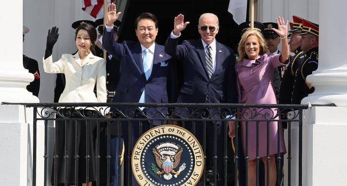 4月26日,美国总统拜登夫妇与韩国总统尹锡悦夫妇在白宫向民众挥手致意