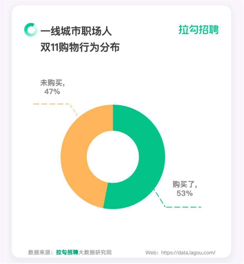 极目新闻记者从《报告》中梳理发现,从消费者角度来看,对于双11的购物行为,职场人变得更加理性和谨慎。《报告》显示,在一线城市的受访职场人中,在双11进行购物的职场人占比为53%,未购物的职场人占比47%,近五成职场人放弃在双11购物。
