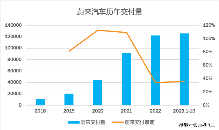 交付量是新势力的生死线,没有交付量,那么什么都不会有。2022年以前,蔚来的交付量增速一直处于高增长状态。即使2021年交付9.14万辆,没能完成10万辆目标,但是交付增速依旧保持在109%的高位上。不过,2022年蔚来迎来拐点,全年交付12.25万辆,交付增速骤降至34%,首次跑输大盘。今年虽然有所反弹,到交付增速依然徘徊在40%左右的低位。从交付量增速方面来看,蔚来似乎早已丧失了往日的锐气。
