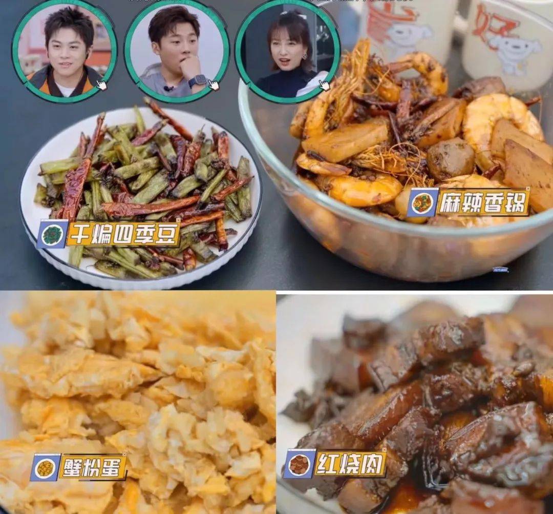 经超在厨房忙活了一会儿,很快就端出了红烧肉、干煸豆角、麻辣香锅、蟹粉蛋⬇️