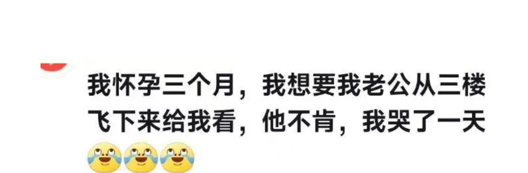 比如,有位网友曾经分享说,自己怀孕3个月的时候,想让老公凑个三楼上飞下去给她看,结果她老公不肯,导致她哭了一天。