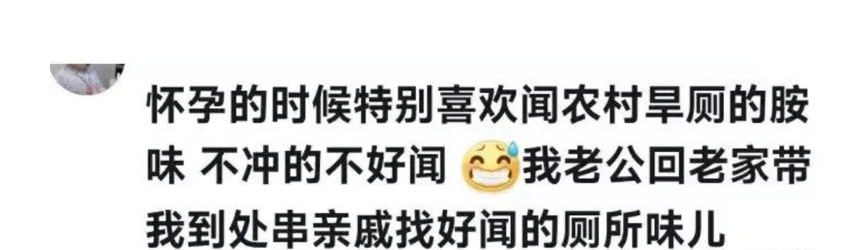 还有一位网友分享了自己怀孕的奇葩操作,她说自己怀孕后,特别喜欢闻农村旱厕的味道,后来实在没办法,她老公带着她回老家到处串亲戚,找好闻的厕所味。