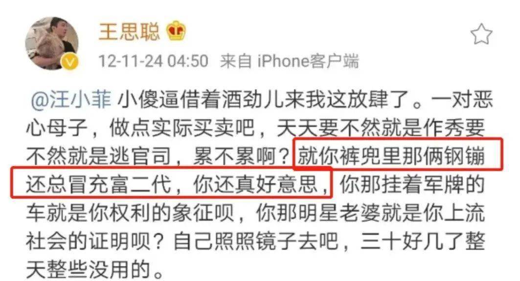 这一年,23岁的王思聪在大S婚礼之后,于个人微博上对张兰和汪小菲母子冷嘲热讽。