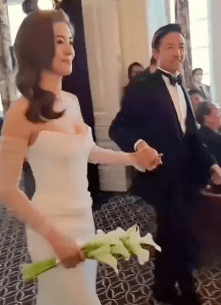之后的视频中,又曝光了婚宴现场,吴千语换上了白色露肩礼服,搭配一头波浪卷发,显得十分优雅知性,手里拿着长捧花,在亲朋好友的注目下走进会场,举行结婚仪式。