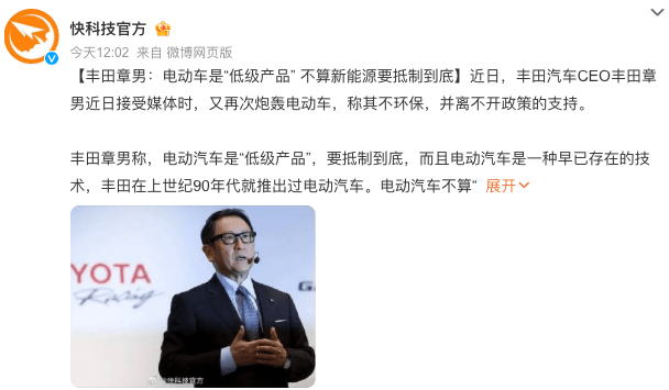 丰田章男又一次对电动车发起言论进攻。据媒体报道,近日,丰田汽车董事长丰田章男在接受采访时称,电动汽车是“低级产品”,不算新能源,要抵制到底。