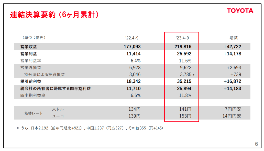 据丰田汽车发布的2024财年(2023年4月-2024年3月)第二季度财报显示,报告期内丰田汽车销售收入为11.43万亿日元(约合人民币5560亿元),同比增长24%,超过此前市场的预期;营业利润1.44万亿日元(约合人民币700亿元),同比增长156%;净利润为1.28万亿日元(约合人民币622亿元),同比增加194%。此外,营业利润率从同期的6.1%翻番至12.6%。