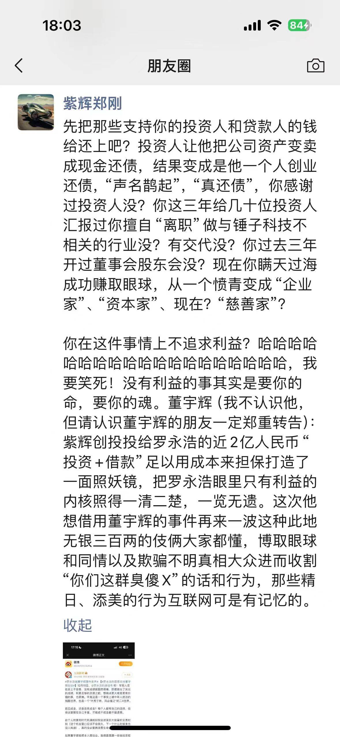 他还说:“紫辉创投投给罗永浩的2亿人民币‘投资+借款’足以用成本来担保打造了一面照妖镜,把罗永浩眼里只有利益的内核照得一清二楚,一览无遗。”郑刚甚至还说:“那些精日、添美的行为互联网可是有记忆的。”