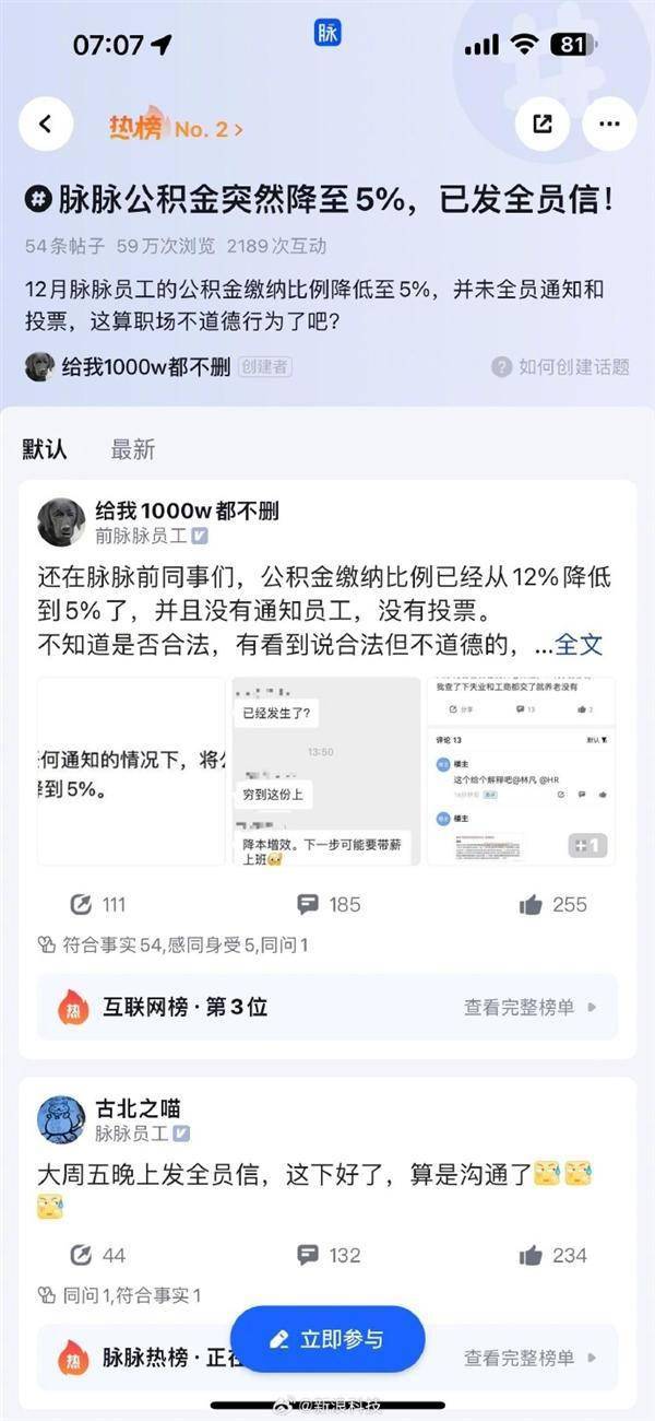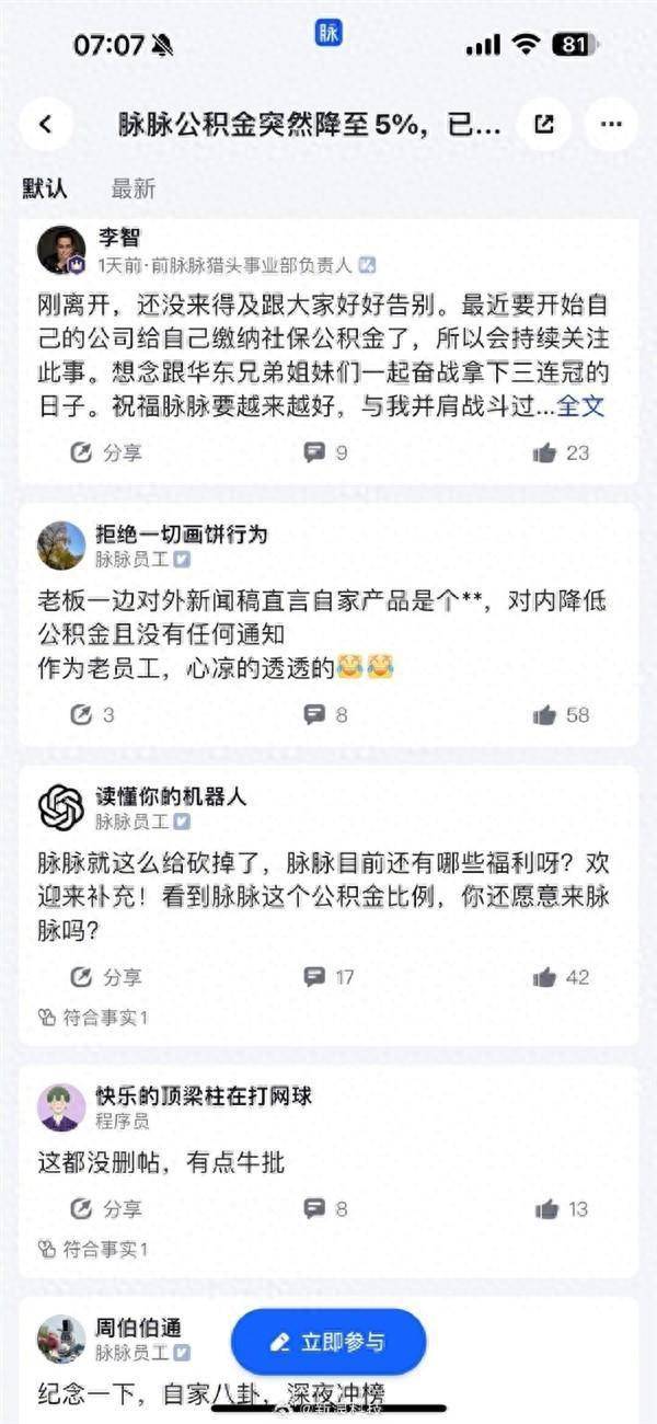 脉脉员工自曝公司取消早晚餐饭补福利 下调公积金缴纳比例至5%