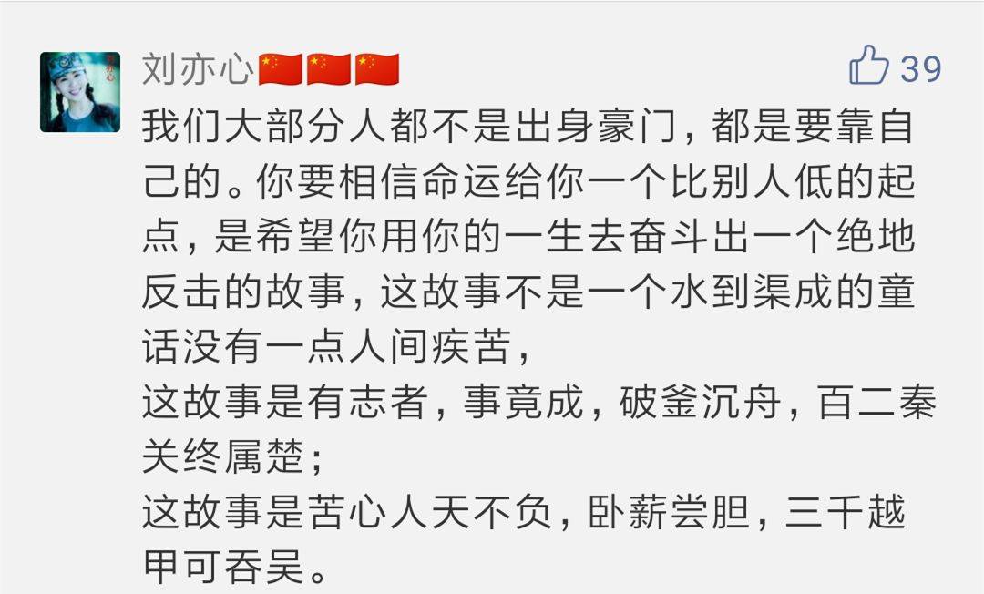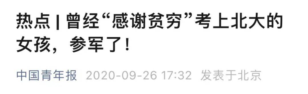 河北新闻网报道称,事实上,2019年,王心仪报名参军,因在综合素质考评中仰卧起坐一项不合格而遗憾落选,伤心难过之时,北京市征兵办的同志开导她:“不要被眼前的困难打倒,要坚定理想信念,加强锻炼,下次报名还有机会。以前你感谢贫穷,让你学会了独立、自强和拼搏,从而考上了北大;今后你会感恩军营,让你在部队的大熔炉里淬炼成钢,成长、成才。”一席鼓励的话让王心仪重燃了希望。