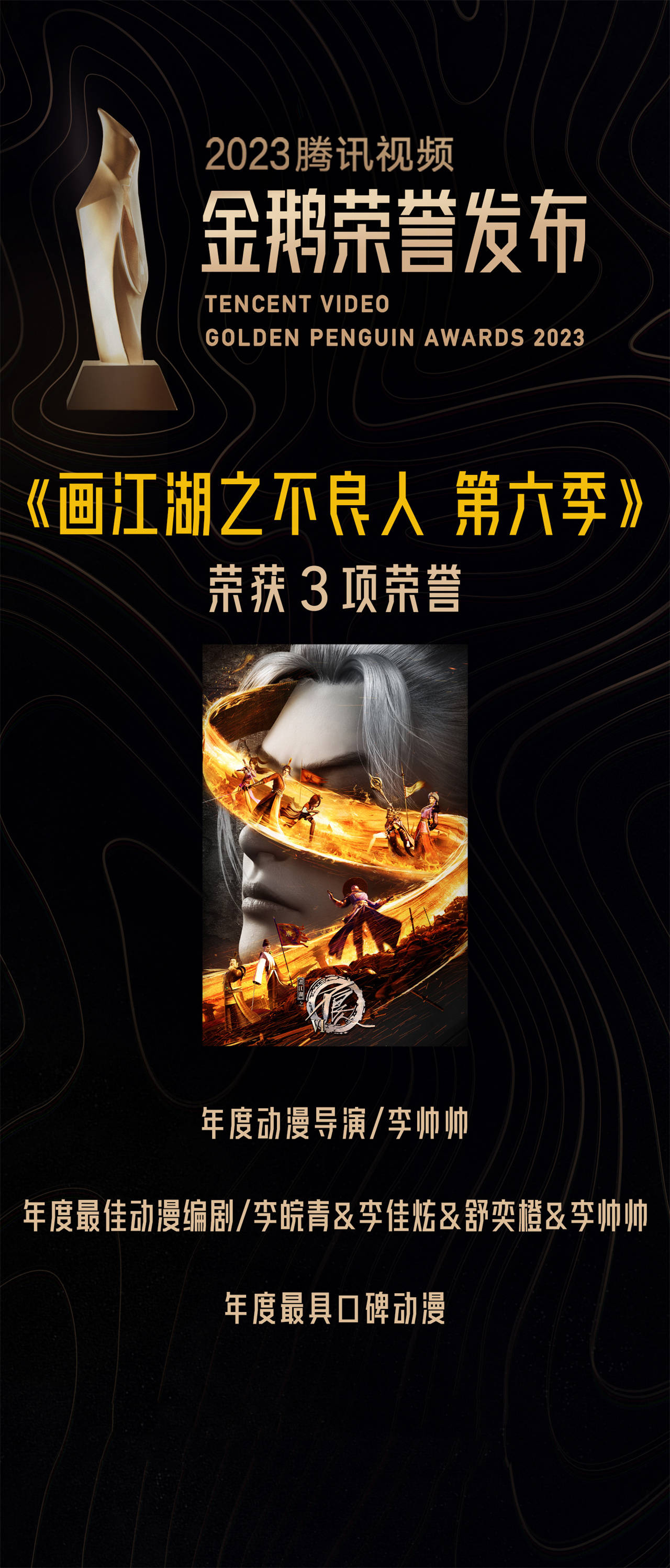 然后就是《画江湖之不良人》第六季这部动漫作品,这部动漫作品获得的奖项也是丝毫不比《斗罗大陆》少,甚至《画江湖之不良人》第六季和《斗罗大陆》第一部一样都是获得三大奖项。《画江湖之不良人》第六季获得的三大奖项分别是年度最具口碑动漫、年度动漫导演李帅帅以及年度最佳动漫编剧。